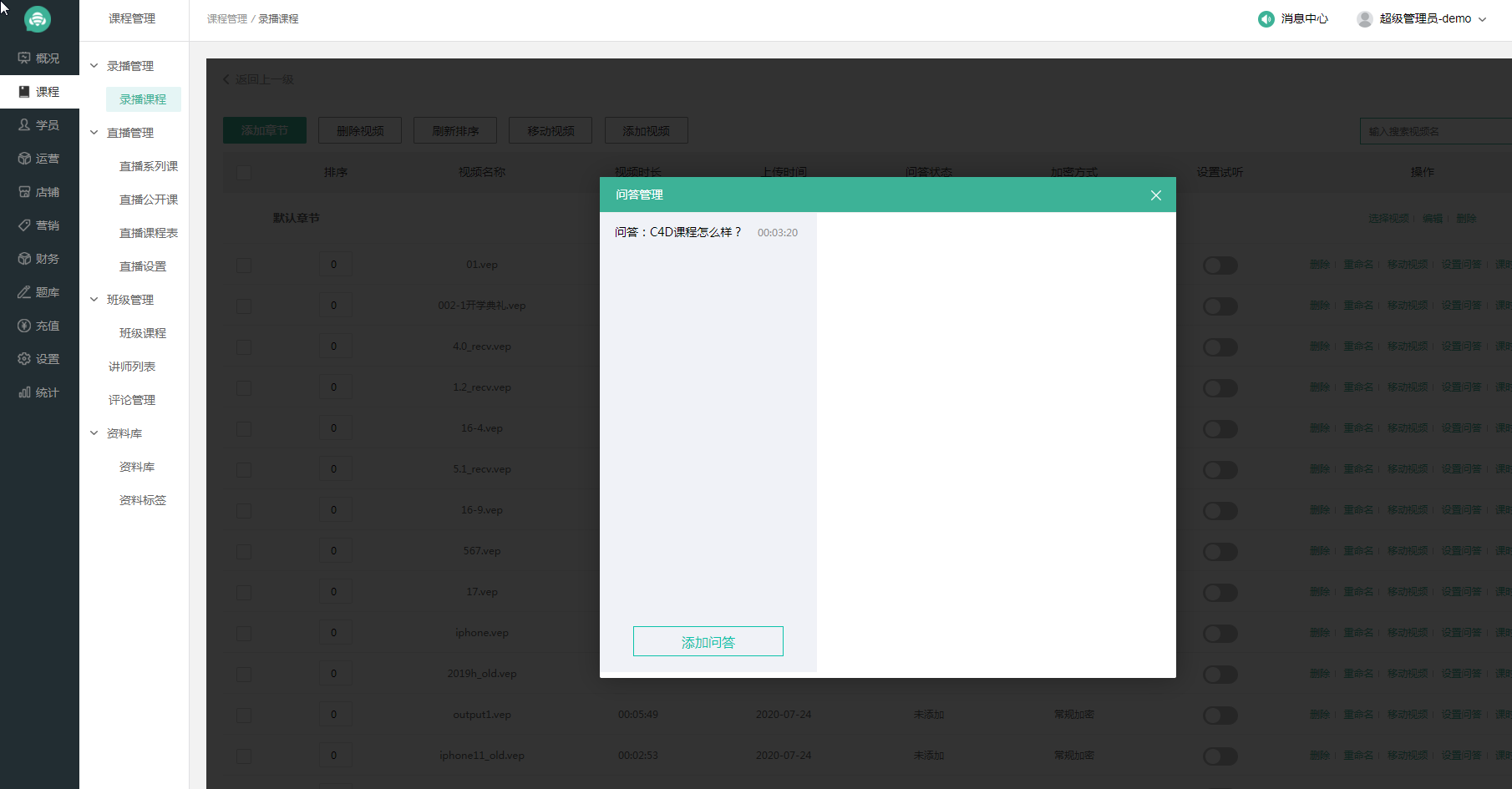 3、選擇已常規加密的視頻課程,才可以設置防翻錄問答。點擊“設置問答”,彈出問答管理設置。