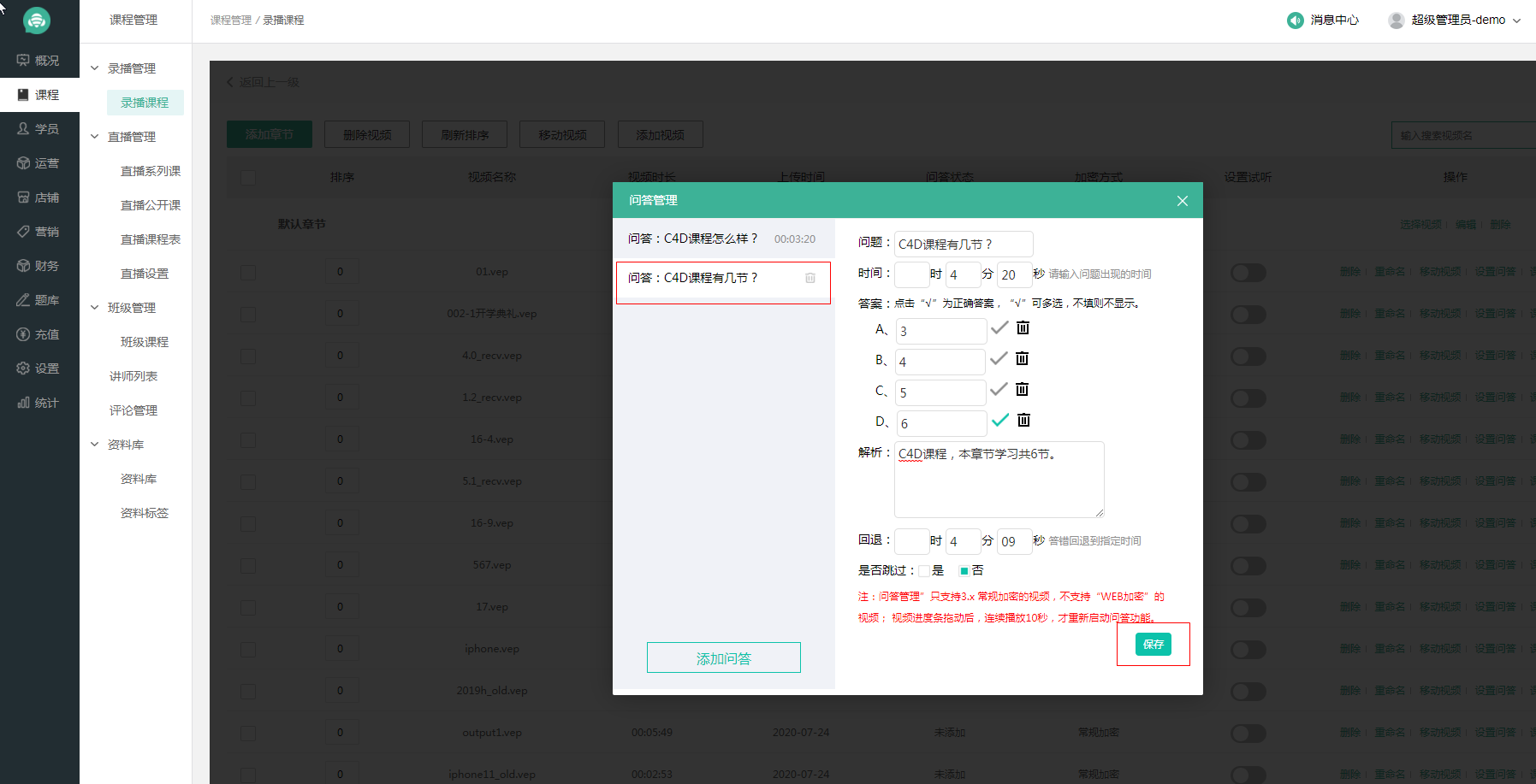 5、在問答管理中,選擇提問的問答,進行設置,如彈出問答時間、答案、解析、問答回退時間等,設置完成點擊“保存”。